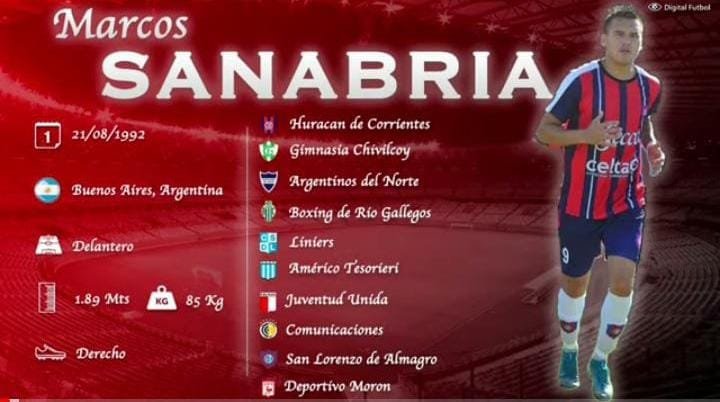 El goleador que llegó es Marcos Sanabria, que es de la provincia de Buenos Aires. Tiene 31 años, hizo Inferiores en el Deportivo Morón, donde debutó a los 17 años. Luego pasó por la Reserva de San Lorenzo de Almagro, también pasó por Comunicaciones, Tesorieri de La Rioja, Juventud Unida y Liniers, Boxing de Río Gallegos y el Regional pasado lo jugó en Huracán de Corrientes.
