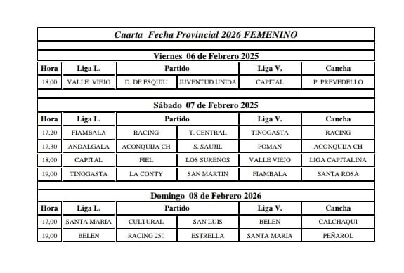El Torneo Provincial de Fútbol Femenino 2026 ya tiene definida la agenda correspondiente a la cuarta fecha, que se disputará entre el viernes 6 y el domingo 8 de febrero en distintos puntos de la provincia. Con el certamen entrando en una etapa clave, los cruces comienzan a ser determinantes en la lucha por la clasificación a la siguiente fase.