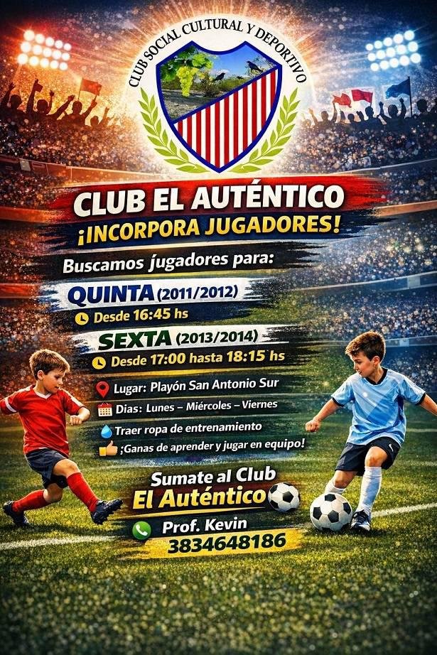 Con la mirada puesta en el futuro, el Club El Auténtico puso en marcha una nueva convocatoria destinada a reforzar sus divisiones inferiores, abriendo las puertas a jóvenes futbolistas de la zona que deseen sumarse a su proyecto deportivo. La iniciativa apunta a seguir fortaleciendo la base del club de cara a la próxima temporada.