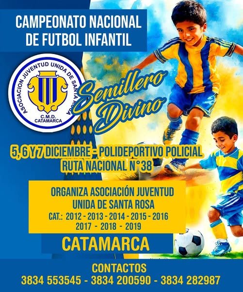 Del 5 al 7 de diciembre, Catamarca recibirá a cientos de pequeños futbolistas de todo el país para disputar una nueva edición del Campeonato Nacional de Fútbol Infantil “Semillero Divino”, que se llevará a cabo en las instalaciones del Polideportivo Policial, sobre Ruta Nacional N° 38.