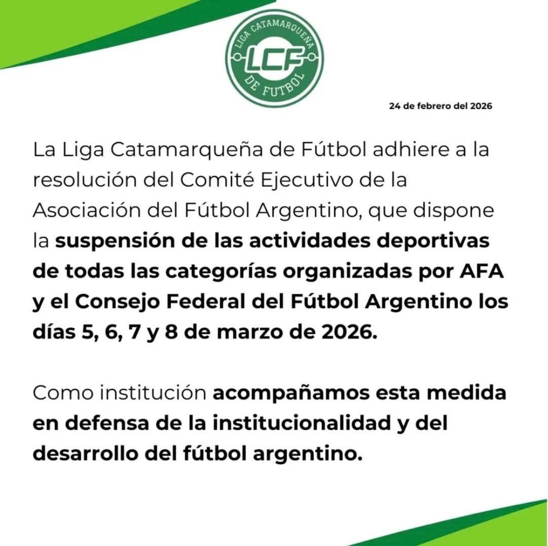 En sintonía con la determinación adoptada por la Asociación del Fútbol Argentino, la Liga Catamarqueña de Fútbol confirmó que interrumpirá todas sus competencias entre el 5 y el 8 de marzo inclusive. La medida alcanza a cada una de las categorías que integran el fútbol local.