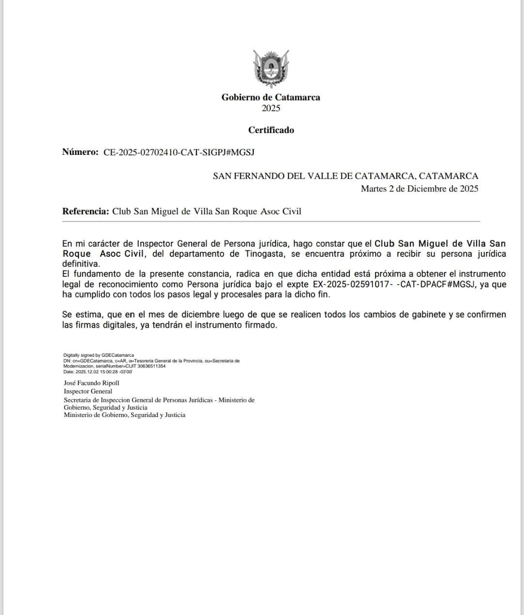 La Liga Tinogasteña argumenta que nuestro club no cuenta con personería jurídica, cuando el señor Juarez nos acompaño a gestionar la mismas y basándose en eso, decide dejarnos afuera. Aclaramos públicamente que contamos con toda la documentación correspondiente, con papeles en mano, avalados por la Personería Jurídica de la Provincia de Catamarca. Aun así, aquí se niegan a reconocerla.