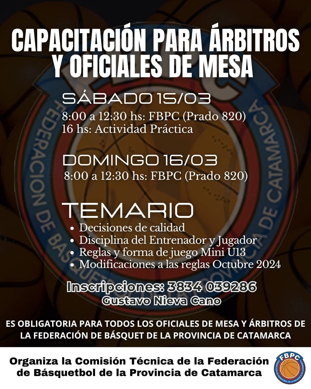 La Comisión Técnica de la Federación de Básquetbol de la Provincia de Catamarca organiza una capacitación obligatoria para todos los árbitros y oficiales de mesa que la conforman. La misma se desarrollará el sábado 15 y domingo 16 de marzo, con actividades teóricas y prácticas.