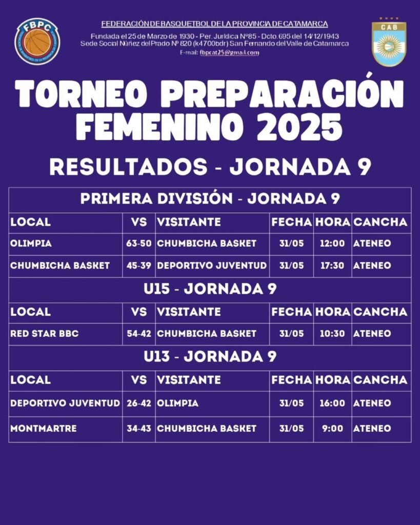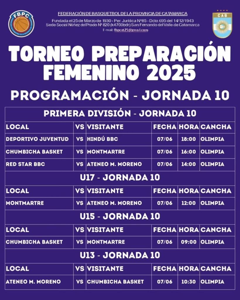 La Federación de Básquetbol de la Provincia de Catamarca dio a conocer la programación para el desarrollo de la jornada 10, última de la fase regular, del Torneo Preparación 2025 de Básquet Femenino.