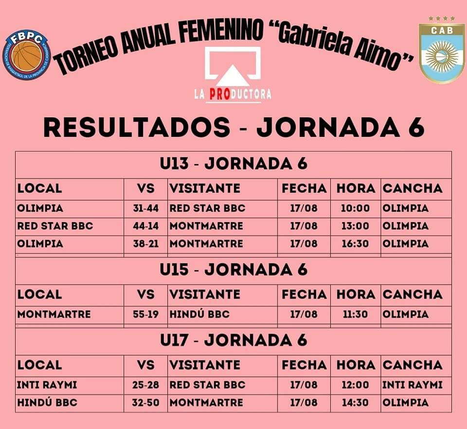 Con la disputa de seis partidos, las Divisiones Formativas completaron la Jornada 6 del Torneo Anual Femenino 2024, denominado «Gabriela Aimo», organizado por la Federación de Básquetbol de la Provincia de Catamarca.