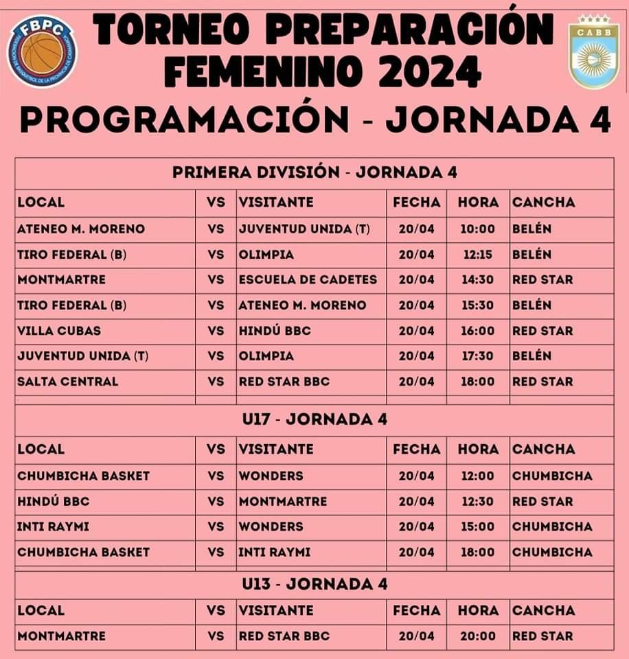 Éste próximo sábado 20 de abril, en Capital, Chumbicha y Belén, se disputará la Jornada 4 del Torneo Preparación del Básquet Femenino de la Federación de Básquetbol de la Provincia de Catamarca.
