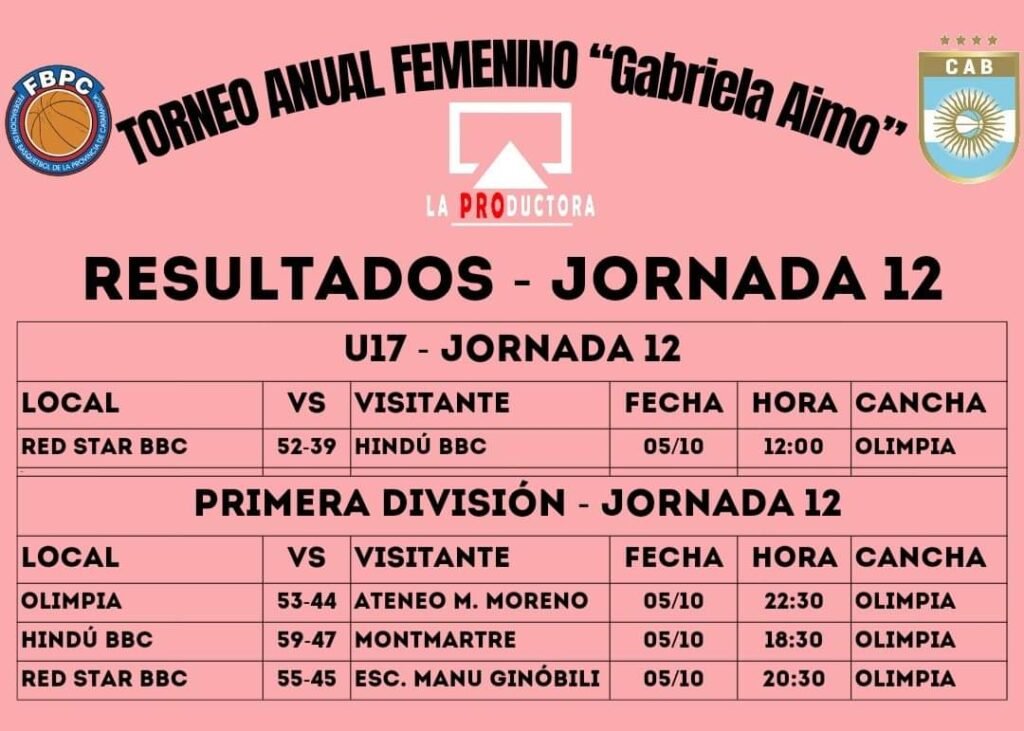 Se completó la Jornada 12 del Torneo Anual 2024 «Gabriela Aimo» del Básquet Femenino de la Federación de Básquetbol de la Provincia de Catamarca, en la cancha de Olimpia, definiendo los equipos semifinalistas de la Copa de Oro de la Primera División: Hindú BBC, Red Star BBC y Olimpia, que se suman a Salta Central, que se clasifico la semana anterior.