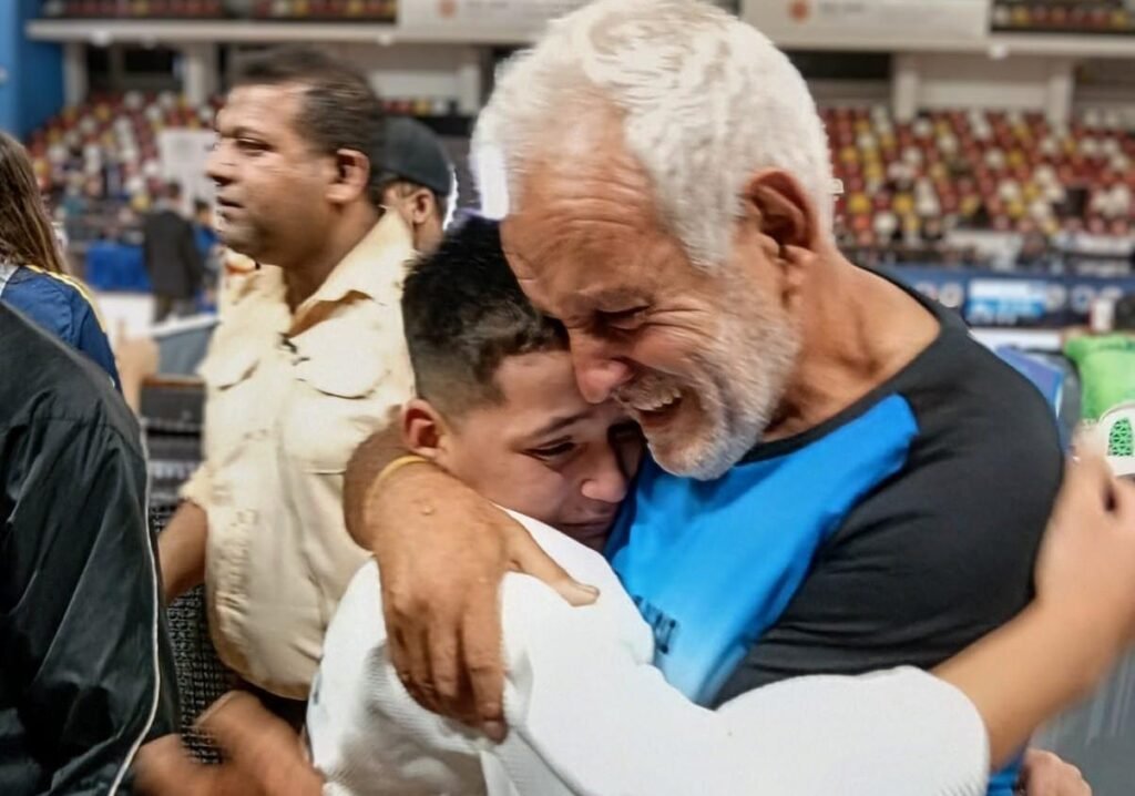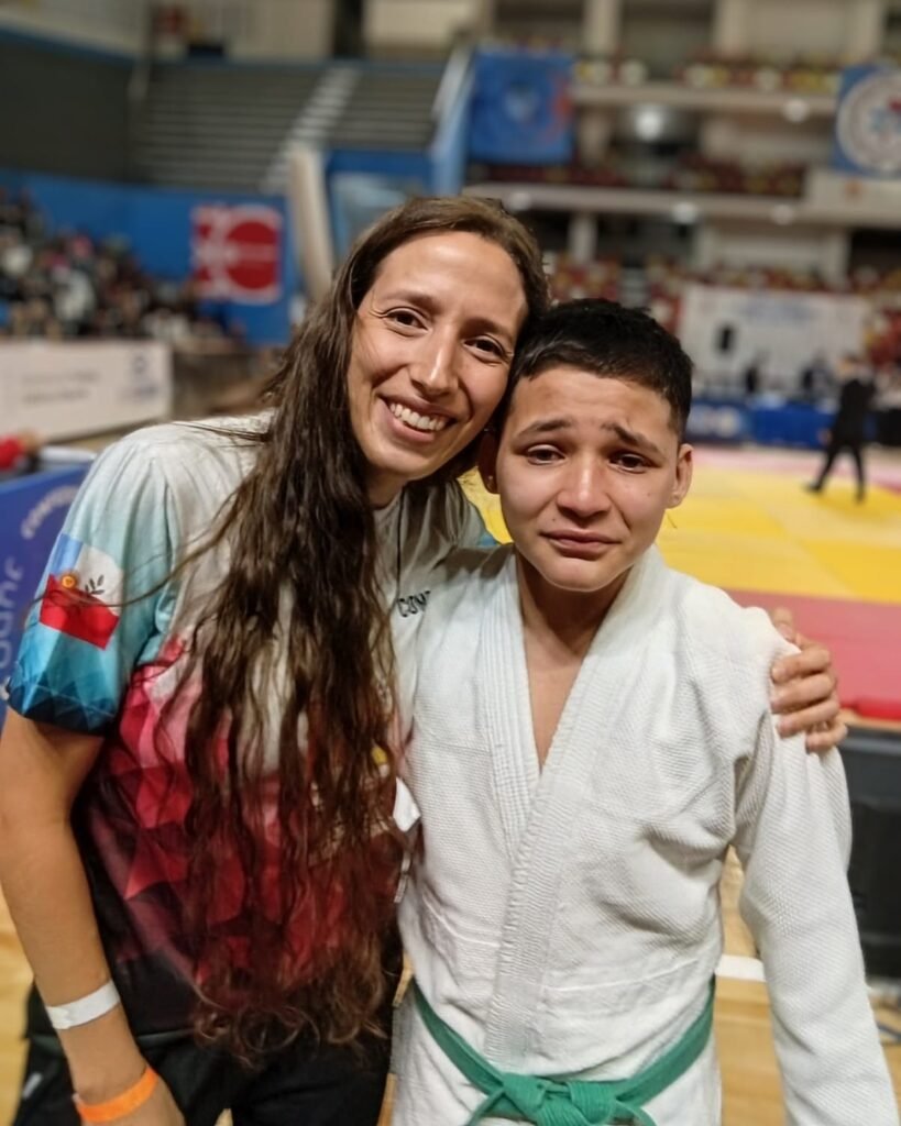 El joven judoca no pudo contener la emoción ante el logro y entre lágrimas lo festejó junto a Carlos Romanos y Giselle Romanos que son sus profes en el Polideportivo de las 250 Viviendas.