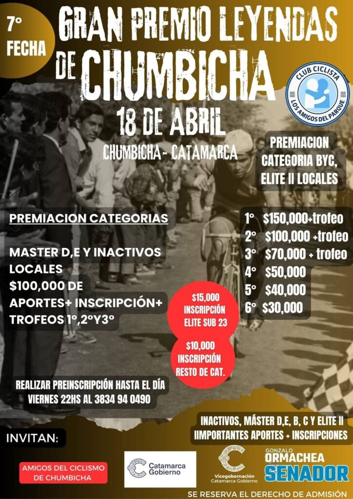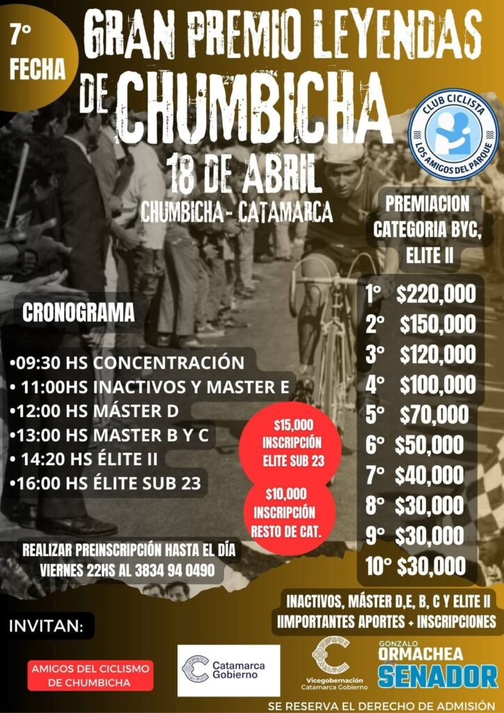 La localidad de Chumbicha será escenario de una nueva fiesta del ciclismo con la llegada de la séptima fecha del tradicional “Gran Premio Leyendas”, una competencia que continúa convocando a corredores de distintas categorías y a un público apasionado por este deporte.
