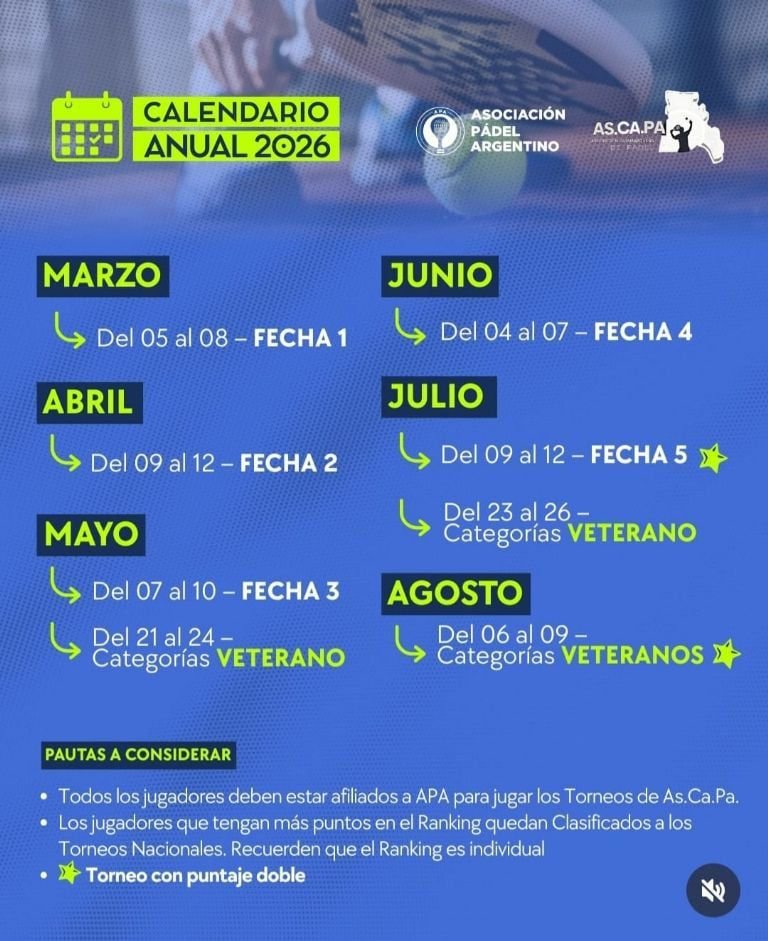 La Asociación Catamarqueña de Pádel (As.Ca.Pa) dio a conocer oficialmente el calendario de competencias para la temporada 2026, que marcará el desarrollo del pádel provincial y definirá las clasificaciones a los Torneos Nacionales organizados por la Asociación de Pádel Argentino (APA).