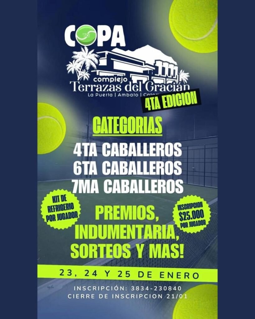 En el caso de La Puerta, se desarrolla la cuarta edición de la Copa Terrazas del Gracián, un torneo ya instalado en el calendario deportivo de la zona. Las inscripciones cerraron el pasado 21 de enero y la competencia ofrece premios, sorteos, indumentaria y diversas sorpresas para los participantes. El costo de inscripción fue de 25 mil pesos por jugador y las categorías habilitadas son 4ta caballeros, 6ta caballeros y 7ma caballeros.