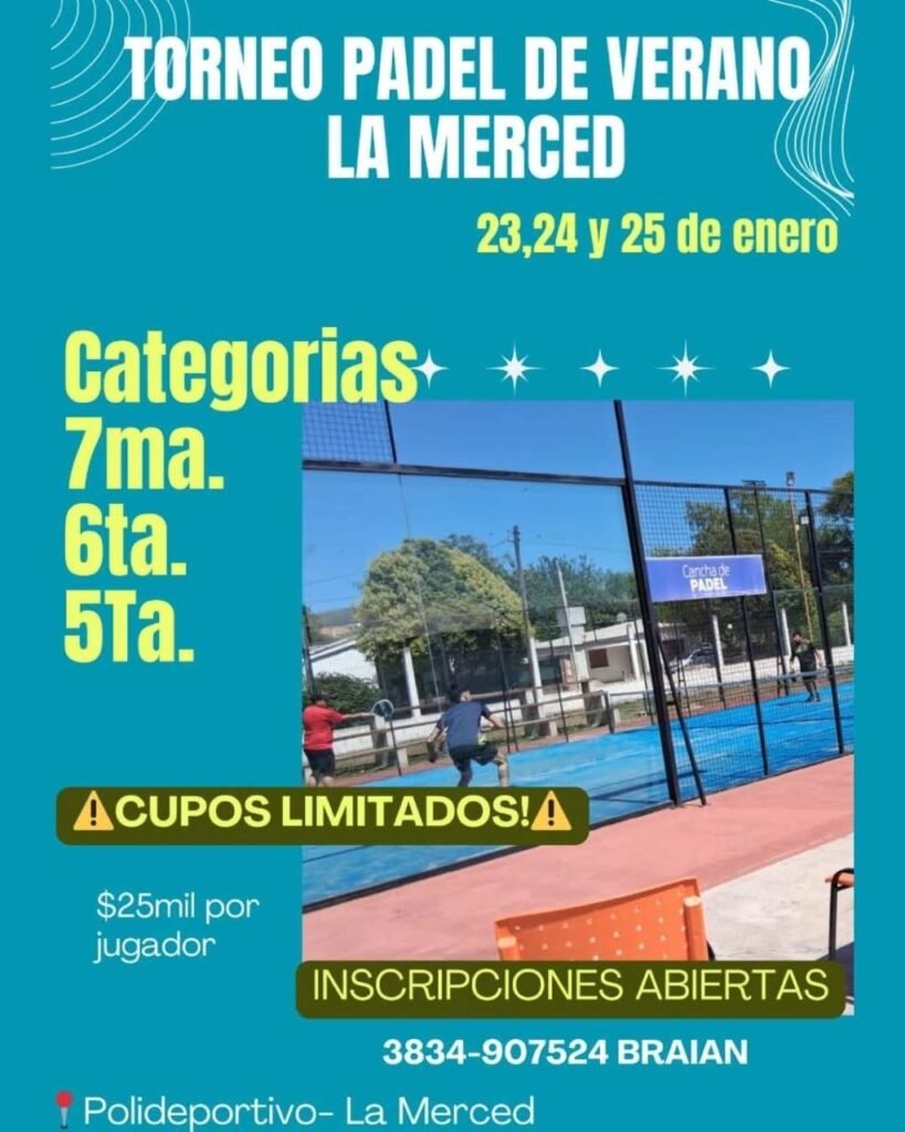 Por su parte, en La Merced se lleva a cabo el Torneo de Pádel de Verano, que también fijó una inscripción de 25 mil pesos por jugador. Con cupos limitados, el certamen registró una alta demanda, reflejando el interés creciente por este deporte. En esta competencia, las categorías en juego son 7ma, 6ta y 5ta, permitiendo la participación de jugadores de distintos niveles.
