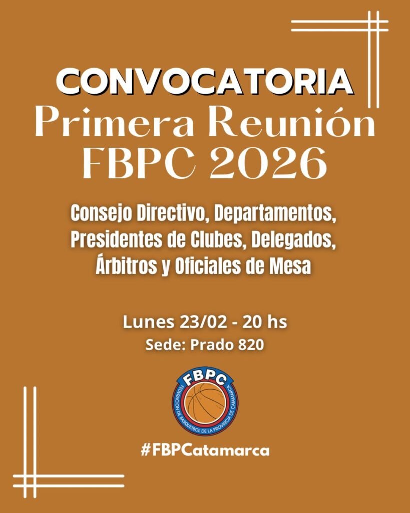 La Federación de Básquetbol de la Provincia de Catamarca (FBPC) convocó a la primera reunión del año 2026, que se llevará a cabo este lunes 23 de febrero a las 20 horas en su sede federativa, ubicada en Prado 820.