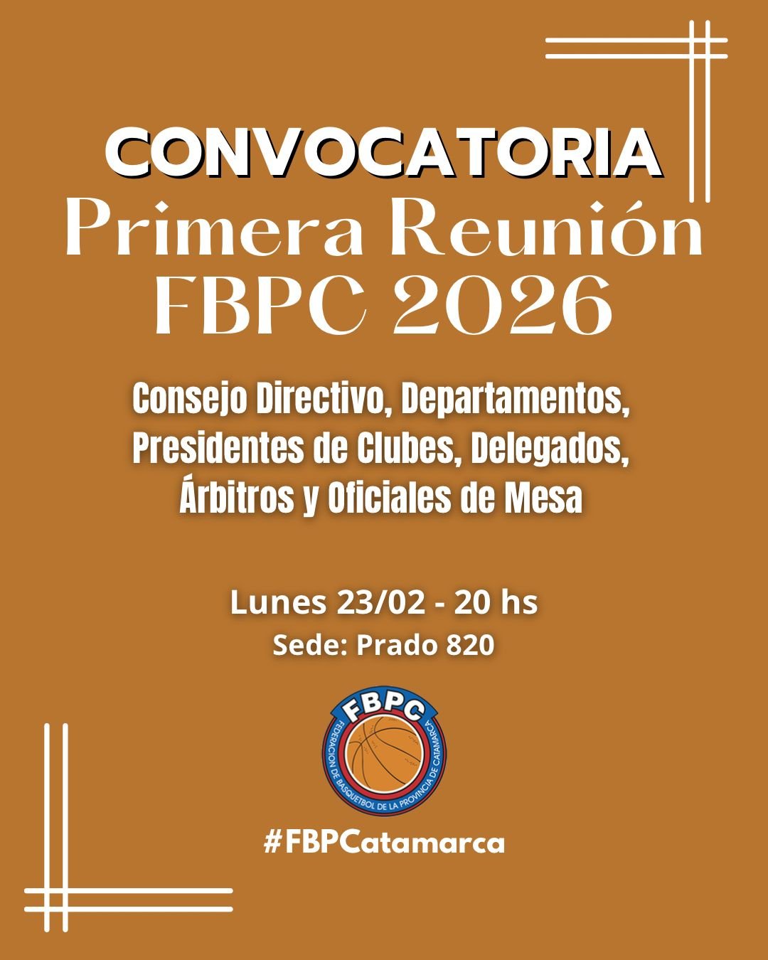 La Federación de Básquetbol de la Provincia de Catamarca (FBPC) convocó a la primera reunión del año 2026, que se llevará a cabo este lunes 23 de febrero a las 20 horas en su sede federativa, ubicada en Prado 820.