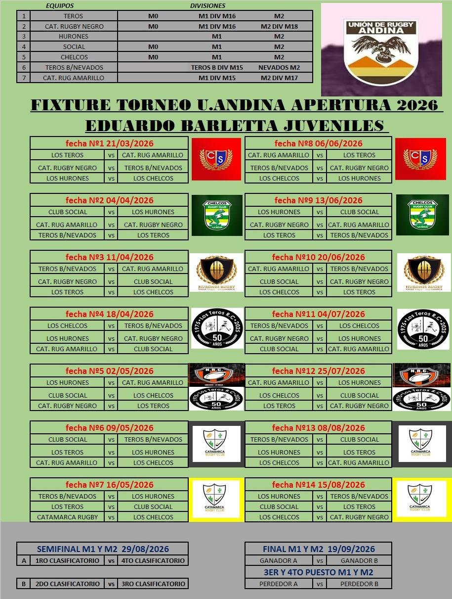 La Unión Andina de Rugby confirmó el calendario oficial y el formato de competencia para el Torneo Apertura de Juveniles 2026, certamen que llevará el nombre de Copa “Eduardo Barletta” y que reunirá a las principales canteras del rugby regional a partir del próximo 21 de marzo.