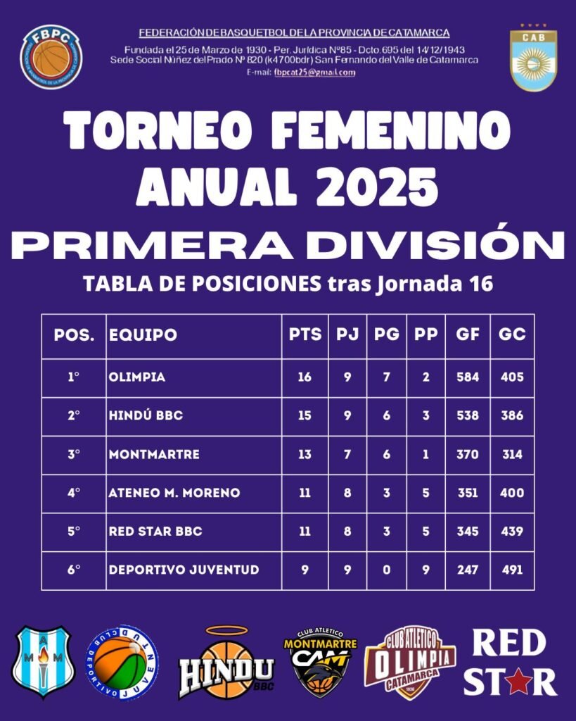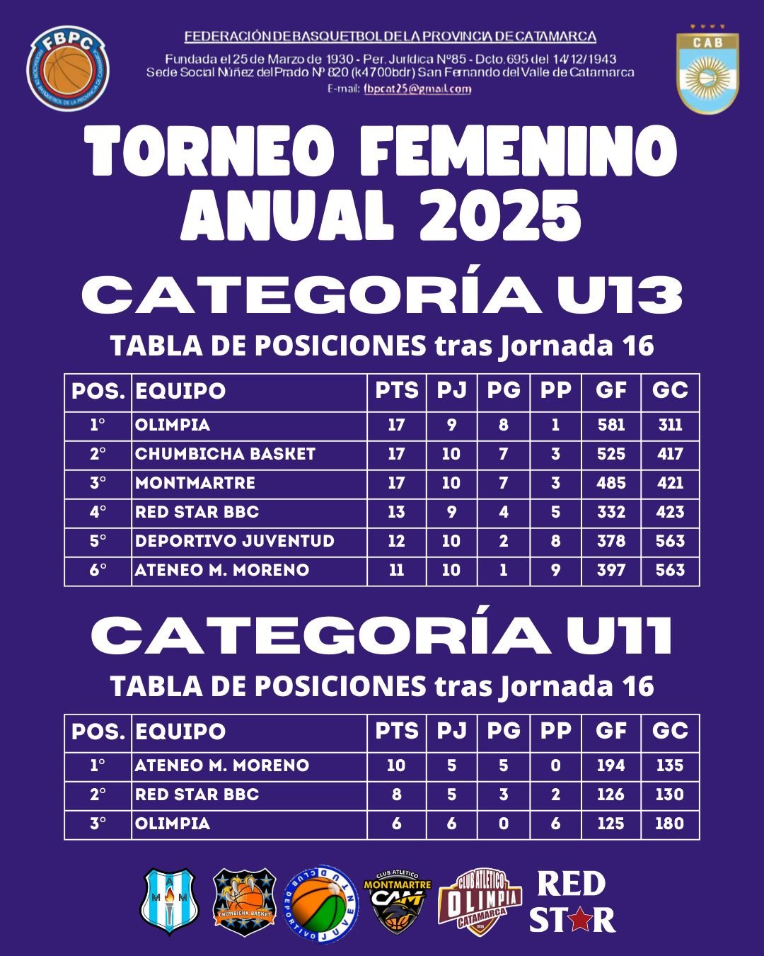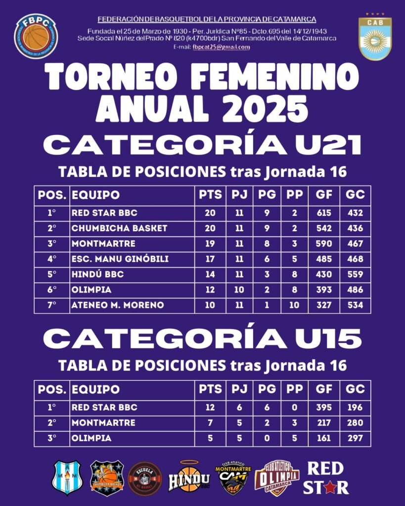 Tras la disputa de la Jornada 16 del Torneo Anual de Básquet Femenino y de la Fecha 4 del Torneo Pre Federal, así se ubican las principales posiciones de los certámenes de la Federación de Básquetbol de la Provincia de Catamarca.