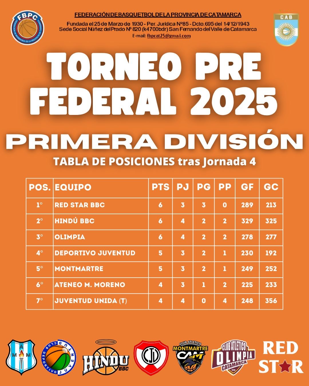 Por el lado del Pre Federal, que clasificará a los tres representantes de la provincia para la Liga Federal 2026, está encabezado por un triple empate en seis puntos: Red Star tiene un partido menos pero está invicto con tres ganados; e Hindú y Olimpia con dos victorias y dos caídas. Los siguen Montmartre y Deportivo Juventud (récord de 3-1), Ateneo (1-2) y Juventud Unida de Tinogasta que aún no pudo ganar en cuatro presentaciones.