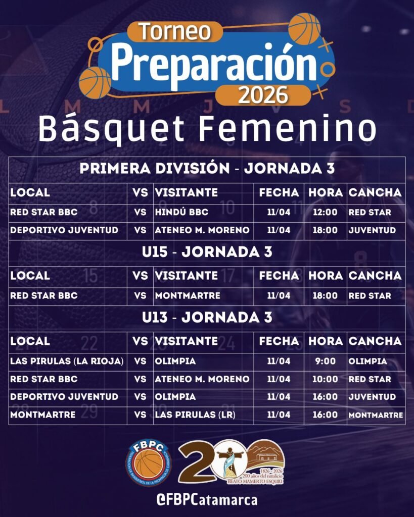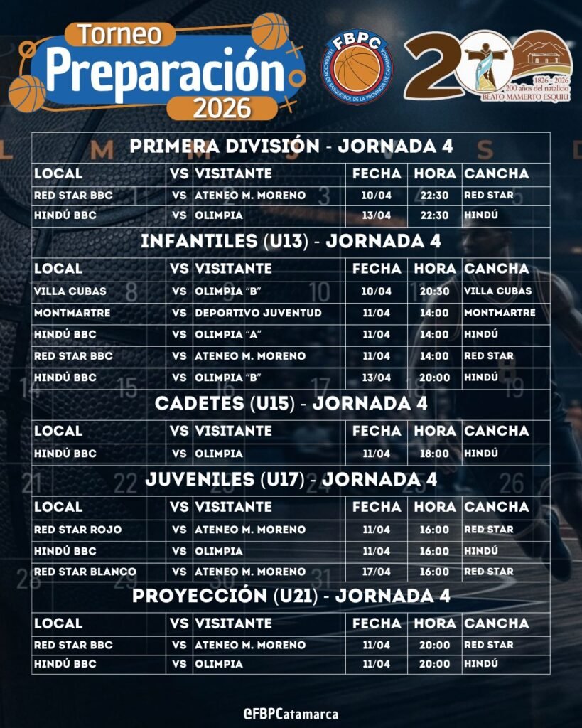 Desde este viernes se pondrá en marcha una nueva y nutrida programación del Torneo Preparación 2026 “Bicentenario del Natalicio del Beato Mamerto Esquiú”, organizado por la Federación de Básquetbol de la Provincia de Catamarca, con actividad en Primera División, Básquet Femenino, Divisiones Formativas y Minibásquet.