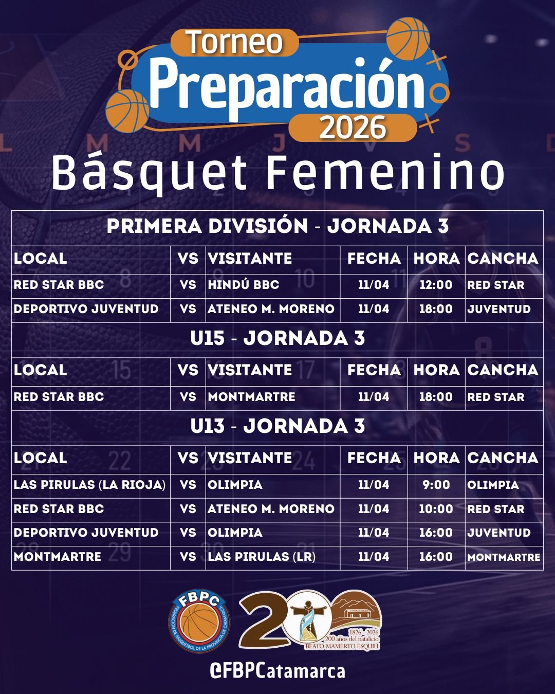 Desde este viernes se pondrá en marcha una nueva y nutrida programación del Torneo Preparación 2026 “Bicentenario del Natalicio del Beato Mamerto Esquiú”, organizado por la Federación de Básquetbol de la Provincia de Catamarca, con actividad en Primera División, Básquet Femenino, Divisiones Formativas y Minibásquet.