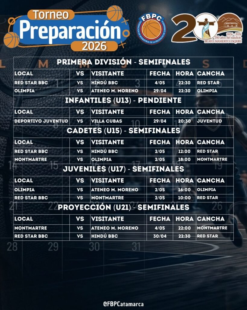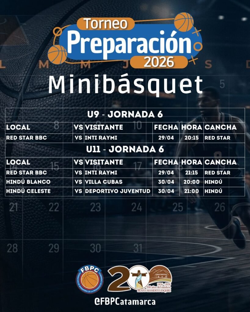 La recta final del Torneo Preparación 2026, denominado “Bicentenario del Natalicio de Fray Mamerto Esquiú”, ya está en marcha y esta semana comenzará a definir a sus protagonistas en todas las categorías. La actividad organizada por la Federación de Básquetbol de la Provincia de Catamarca presenta una agenda intensa, con cruces clave tanto en Primera División como en divisiones formativas.