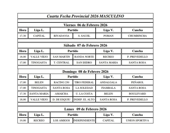 La Fecha 4 se completará el lunes 9 de febrero en Recreo, cuando Los Amigos enfrenten a Independiente de Huillapima desde las 19:00 en el estadio Hermanos Santillán, cerrando otra semana intensa del certamen provincial.