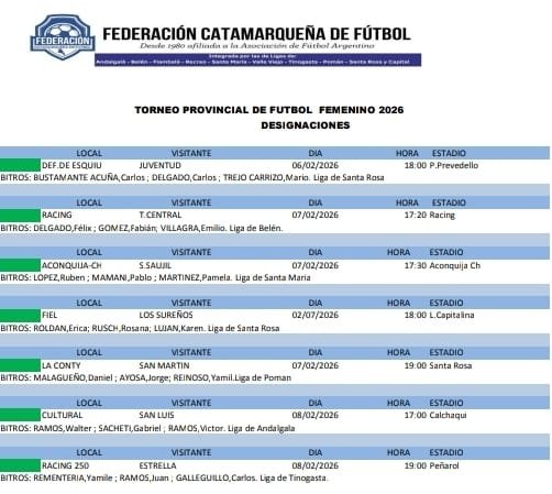 Más tarde, a las 18.00, Club Fiel y Los Sureños se medirán en el estadio Malvinas Argentinas, con arbitraje de Érica Roldán, Rosana Rusch y Karen Luján, también de la Liga de Santa Rosa. El cierre de la actividad sabatina será a las 19.00 en el departamento Santa Rosa, donde La Conty recibirá a San Martín de Fiambalá.