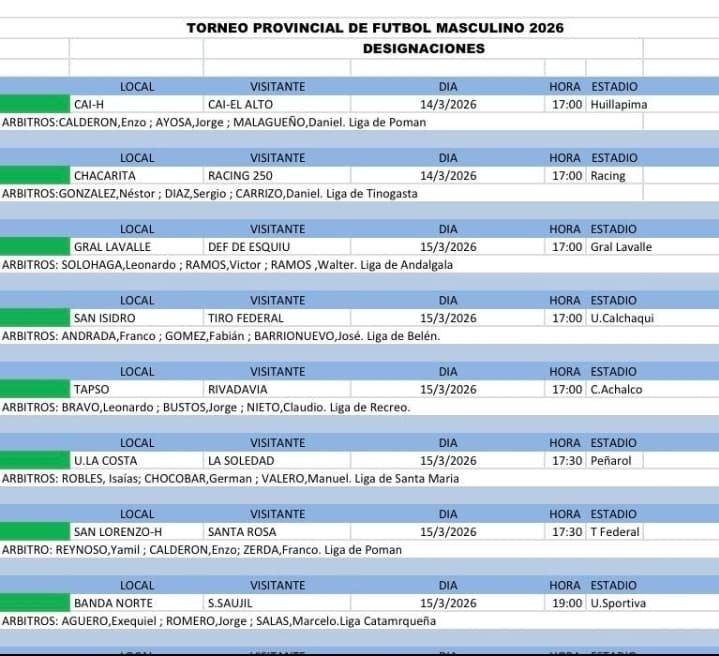La mayor parte de la fecha se desarrollará el domingo 15 de marzo, con una agenda cargada de partidos. Desde las 17 horas, General Lavalle de Pomán enfrentará a Defensores de Esquiú en la cancha de General Lavalle. A la misma hora, San Isidro de Santa María será local frente a Tiro Federal de Andalgalá en el estadio de Unión Calchaquí, mientras que Tapso FC de Santa Rosa se cruzará con Rivadavia de Huillapima en el campo de juego de Colonia de Achalco.